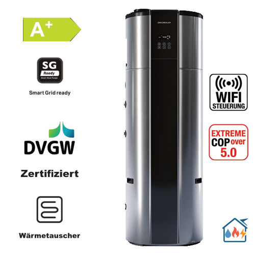 Der Wärmepumpenboiler erreicht einen Leistungskoeffizienten COP von 5.28 nach EN 16147. Die maximale Wassertemperatur beträgt 70 °C, die maximale Wassertemperatur im Wärmepumpenbetrieb bis 70 °C. Eine Legionellenschaltung ist automatisch hinterlegt und wird alle 14 Tage ausgeführt.